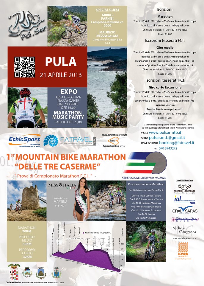 Il 21 aprile 2013 la cittadina di Pula ospiterà la prima edizione della Mountain Bike Marathon “Delle Tre Caserme”, prova di campionato Marathon F.C.I. L’associazione Pul.Sar, in collaborazione con la Federazione Ciclistica Italiana è fiera di presentare quella che si propone di essere una grande festa dello sport.
