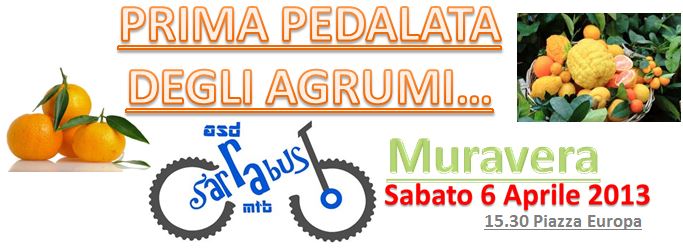 L’ASD MTB-Sarrabus organizza per il giorno 06/04/2013 la prima pedalata degli agrumi in occasione della 41^ Sagra degli agrumi. Il percorso, di pochi chilometri, è sviluppato nel polmone verde (agrumeti) di Muravera, ed è aperto a tutti, in particolare ai bambini. Il percorso si articola ne seguente modo: partenza alle 15,45 da piazza Europa, si arriva sino alla polizia stradale , si percorre tutta la via degli agrumeti sino ad arrivare alla foce del fiume, al ritorno è prevista una tappa nell’agrumeto (Congiu) per alcune spiegazioni sui vari tipi di agrumi; infine è previsto un giro veloce nel centro storico di Muravera con visita nelle Cortes. Arrivo presso Piazza Europa per un rinfresco offerto tutti i partecipanti dalla A.S.D. MTB-Sarrabus e foto di gruppo.
