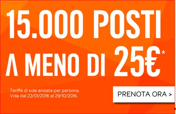 La compagnia aerea a basso costo Easyjet ha appena lanciato un’interessante promozione mettendo a disposizione ben 15.000 posti per volare dall’Italia con tariffe speciali a meno di 25€ a tratta, tasse incluse!La promozione è valida per volare nel periodo compreso tra il 22 gennaio ed il 10 ottobre 2016 fino ad esaurimenti posti.