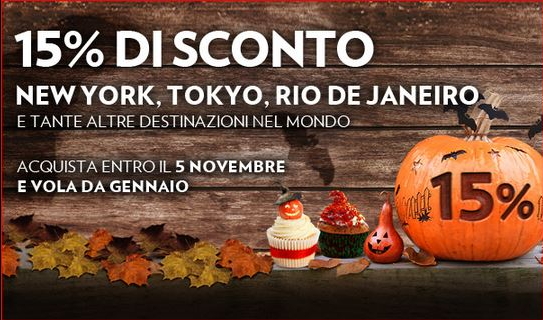 Alitalia ha appena lanciato un’interessante promozione di Halloween che consente di usufruire di uno sconto del 15% per volare in classe Economy e Premium Economy in New York, Tokyo, Rio de Janeiro e tante altre destinazioni nel mondo (in Nord America, Sud America, Africa Occidentale, Giordania, Israele, Libano, Iran, Emirati Arabi Uniti ed Estremo Oriente. Sono esclusi i voli per Caracas e Osaka).