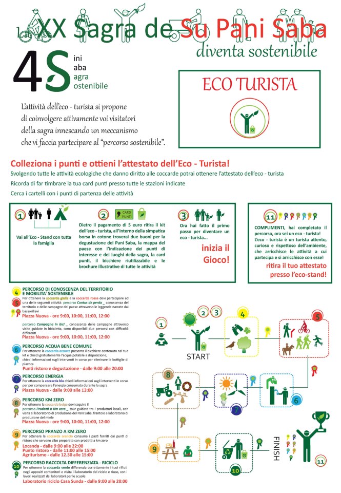 MANIFESTAZIONE ECO-TURISTA: Fornito dell’apposito kit, il turista può condurre percorsi di conoscenza del territorio, delle energie alternative, dell’acqua bene comune, dei prodotti a km zero; nonchè, alla fine della mattina, ristorarsi con prodotti locali e in seguito usufruire del sistema di raccolta differenziata.