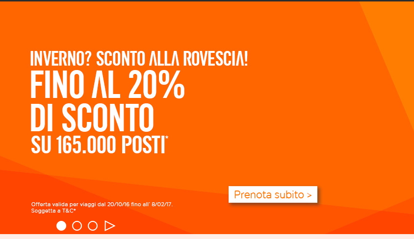 La compagnia low cost Easyjet ha lanciato una promozione per il periodo invernale dal 20 ottobre 2016 all’8 febbraio 2017 con 165.000 posti al 20% sconto.
