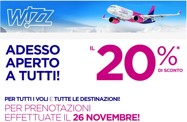 La compagnia aerea a basso costo ungaro-polacca Wizz Air ha appena lanciato un’interessante promozione che consente di usufruire di uno sconto del 20% su tutti i voli e tutte le destinazioni anche per i non iscritti al suo programma.