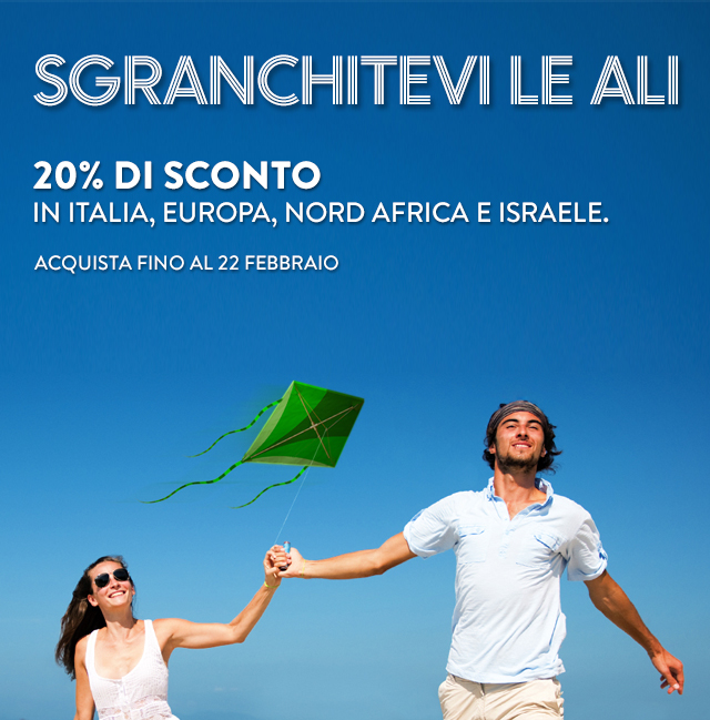 è tempo di volare: scegli l’Italia, l’Europa, il Nord Africa e Israele con il 20% di sconto!