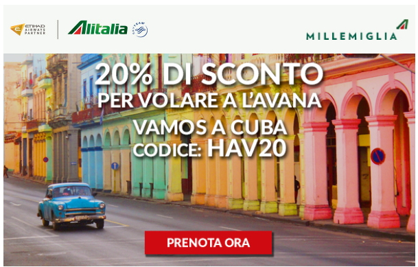 Dal 15 al 20 novembre 2017 acquista il tuo biglietto in Economy, Premium Economy o Magnifica con il 20% di sconto e vola a L’Avana da tutta Italia dal 21 novembre 2017 al 10 aprile 2018! La promozione è soggetta a limitazioni. Per maggiori informazioni clicca qui.