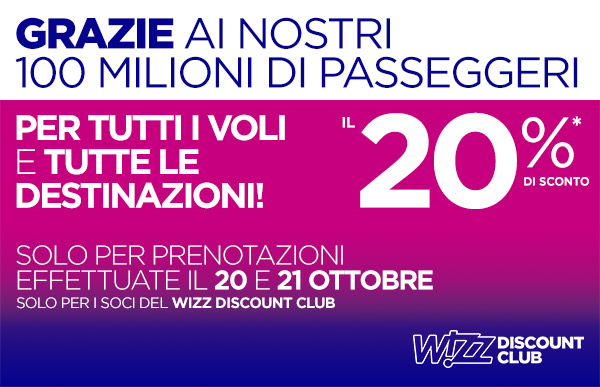 La compagnia low cost dell’Est Europeo, la Wizz Air, propone per martedi 20 e mercoledi 21 uno sconto del 20% su tutte le rotte: basta iscriversi al Wizz Discount Club.
