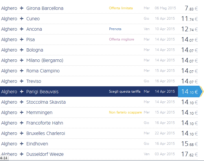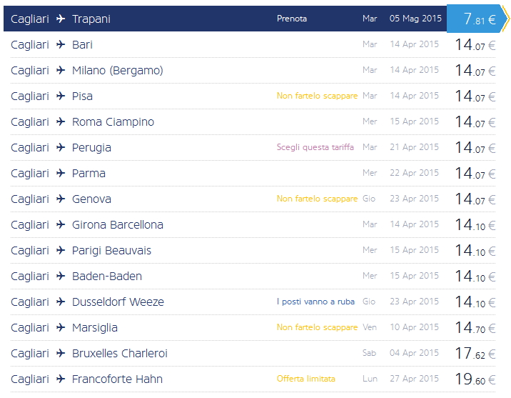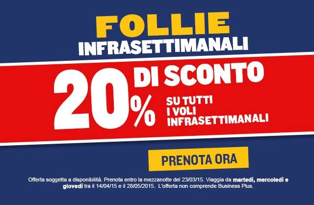 Ryanair lancia una sensazionale offerta: 20% su tutti i voli infrasettimanali: prenota entro la mezzanotte del 23 marzo 2015 e viaggia di martedi,mercoledi e giovedi tra il 14 aprile e il 28 maggio 2015.
