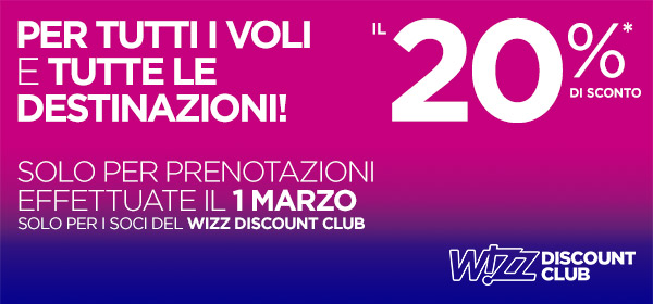 *Lo sconto del 20% si applica su tutte le tariffe del WIZZ Discount Club tasse, oneri obbligatori e supplemento bagaglio a mano piccolo inclusi, (42 x 32 x 25 cm), costi amministrativi esclusi. Lo sconto è valido solo se il socio del WIZZ Discount Club è incluso nella prenotazione. La promozione è valida il 1 marzo dalle 00:00 alle 24.00. Lo sconto del 20% non si applica ai seguenti voli: Budapest – Bordeaux – Budapest il 14 giugno; Budapest – Marsiglia – Budapest il 18 giugno; Budapest – Lione – Budapest il 22 giugno.