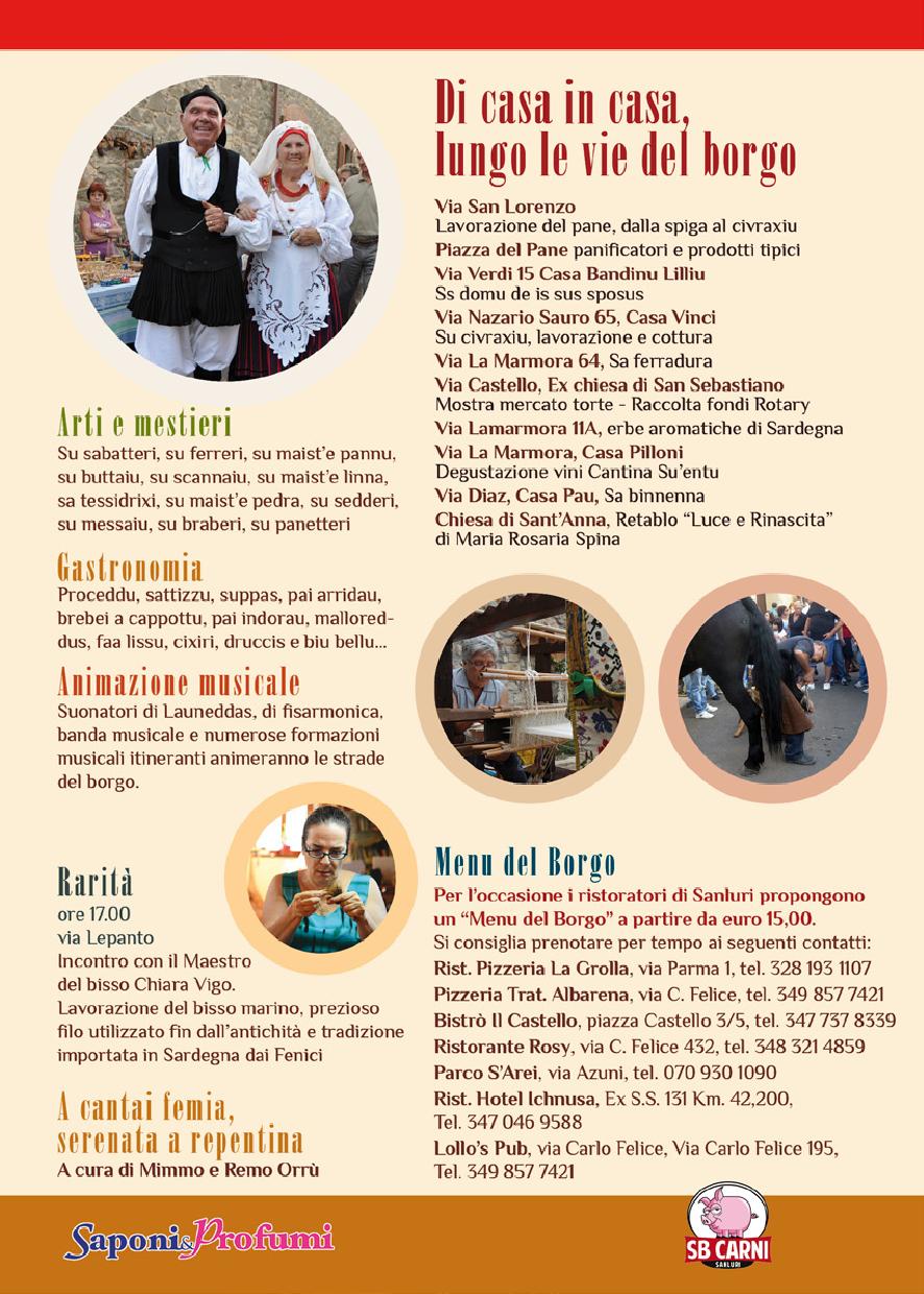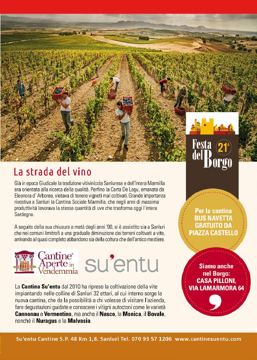 La Festa del Borgo, quest?anno giorno clou 25 settembre 2016, si svolge nel cuore del centro storico percorribile entrando da uno delle quattro porte storiche: Sa potta de su Casteddu, su Potabeddu, sa muralla, e Potixedda. Ci si addentrer? in un percorso in acciottolato tra viuzze, angoli tipici e case campidanesi pronte ad aprire i loro loggiati ai visitatori.
