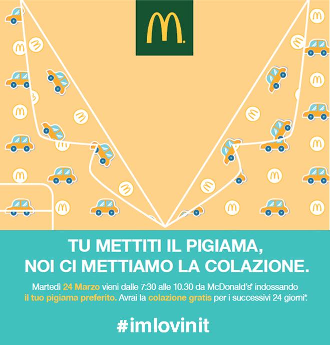 McDonald’s tona a stupirci con una promozione. Se ti presenterai in pigiama a fare colazione martedì 24, dalle 7.30 del mattino alle 10.30, in un ristorante McDonald’s farete subito colazione gratis e in più ricevete altri 24 giorni di colazioni gratuite per i giorni successivi! La promozione è denominata “Tu metti il pigiama, noi ci mettiamo la colazione” e si prepara ad essere una colazione collettiva memorabile!