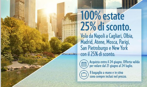 La compagnia aerea Meridiana fly – Air italy ha appena lanciato un’interessante promozione che consente di usufruire di uno sconto del 25% sui voli in partenza da Napoli verso Cagliari, Olbia, Madrid, Atene, Mosca, Parigi, San Pietroburgo e New York!Â