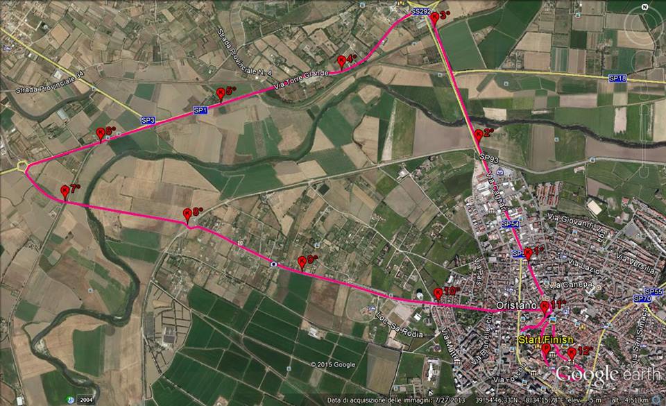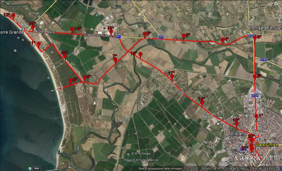STRADARIO –> PARTENZA Via Duomo, Via Sant’Antonio, Via Diego Contini, Piazza Roma, Via Tirso, Ponte Tirso, Rimedio, Strada Provinciale n.1, Bivio Pontile per Strada Provinciale n. 2 (fino al Pontile), 1° Giro di boa, Strada Provinciale 2 (costeggiando la pineta), strada dello Spinnaker, Torre Grande Svolta Via Duca Degli Abruzzi ,(ex. Hotel del Sole), Lungo Mare Eleonora d’Arborea fino alla Villa Baldino, 2° Giro di boa, lungo mare fino alla Piazza della Torre, Via Stella Maris, (uscita per Oristano), Strada Provinciale n. 1 fino alla rotonda, svolta per il Ponte Brabau, ingresso ad Oristano dal prolungamento di Viale Repubblica, Viale Repubblica,Via Tharros, Piazza Roma, Via Diego Contini, Via Sant’Antonio, Via De Castro, Piazza Roma, Via Dritta, Piazza Eleonora, Via Ciutadella De Menorca, Via Carmine, Via G. Maria Angioi, Via Vittorio Emanuele, ARRIVO Via Duomo.