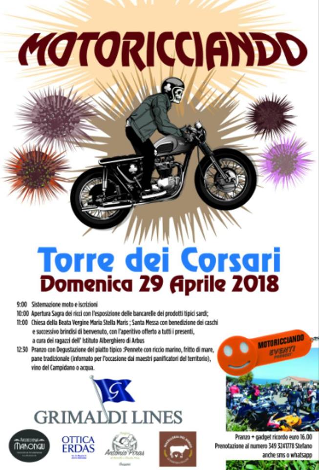 Torna la 3° edizione del Motoricciando, Motoincontro alla sagra dei ricci che si svolge ogni anno nella fantastica località di Torre dei Corsari. Come ogni anno la Proloco insieme alla scuola alberghiera di Arbus propone il loro menù : pennette ai ricci di mare, frittura mista di pesce, contorno, pane e bevanda + un portachiavi ricordo a euro 16.00. Noi le prenotazioni le prendiamo sino a mercoledì 24. Quindi per una buona riuscita della manifestazione vi chiediamo cortesemente di prenotare quanto prima per evitare problemi. Per info e prenotazioni contattare Stefano al 349 3241778