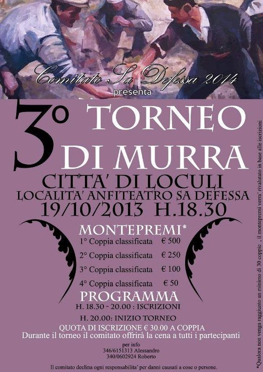 Sabato 19 ottobre 2013 a Loculi si svolgerà il 3° torneo di Murra Città di Loculi loc. Anfiteatro Sa Defessa a partire dalle ore 18,30