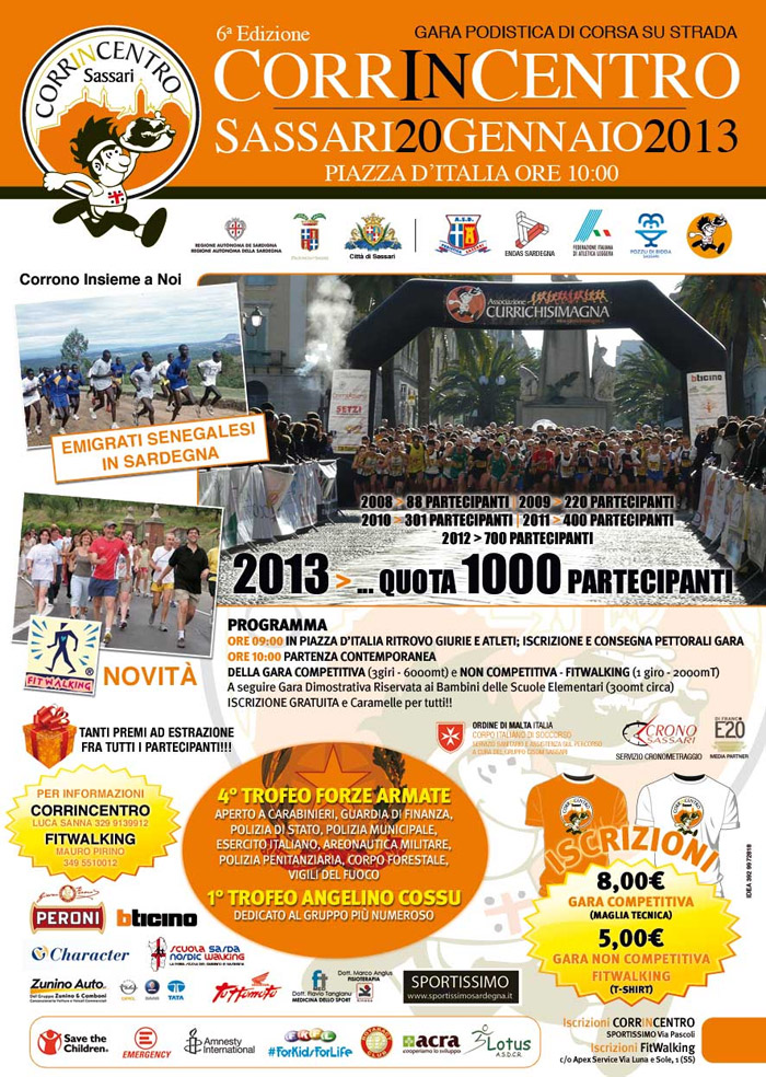 ASSOCIAZIONE CURRICHISIMAGNA E L’ASSOCIAZIONE POZZU DI BIDDA, con la collaborazione della Asd Podistica Sassari, del Rotaract Club Sassari Nord e dell’ENDAS REGIONALE, con il patrocinio del Comune di Sassari e della Provincia di Sassari, nonché con l’approvazione e collaborazione tecnica della FIDAL, Comitato Provinciale, organizza per il 20 gennaio 2013 la 6^ edizione della manifestazione denominata CORRINCENTRO.