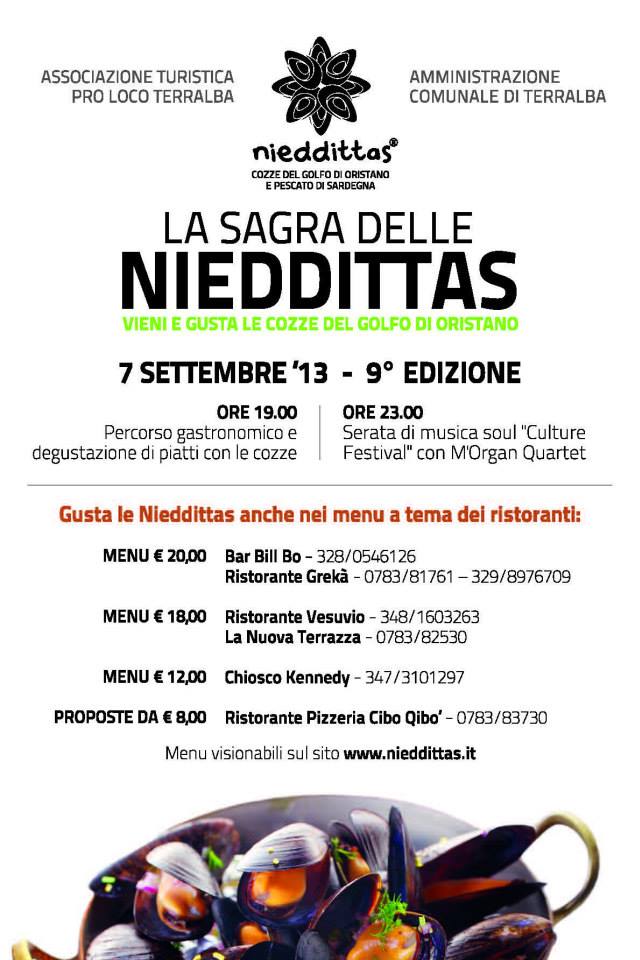 9° EDIZIONE SAGRA DELLE COZZE NIEDDITTAS – TERRALBA – SABATO 7 SETTEMBRE 20139th EDITION NIEDDITTAS MUSSELS FESTIVAL – TERRALBA – SATURDAY SEPTEMBER 7