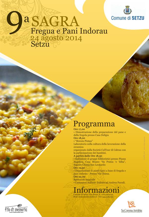 9° SAGRA DE SA FREGUA E PANI INDORAU – SETZU – DOMENICA 24 AGOSTO 20149th FREGUA AND PANI INDORAU FESTIVAL – SETZU – SUNDAY AUGUST 24,2014 Reviewed by admin on . Domenica 24 agosto 2014 Sagra de sa Fregua e de su Pani indorau a Setzu. il programma lo trovate nella locandinaSunday, August 24, 2014 Festival de sa Fregua an Domenica 24 agosto 2014 Sagra de sa Fregua e de su Pani indorau a Setzu. il programma lo trovate nella locandinaSunday, August 24, 2014 Festival de sa Fregua an Rating: 0