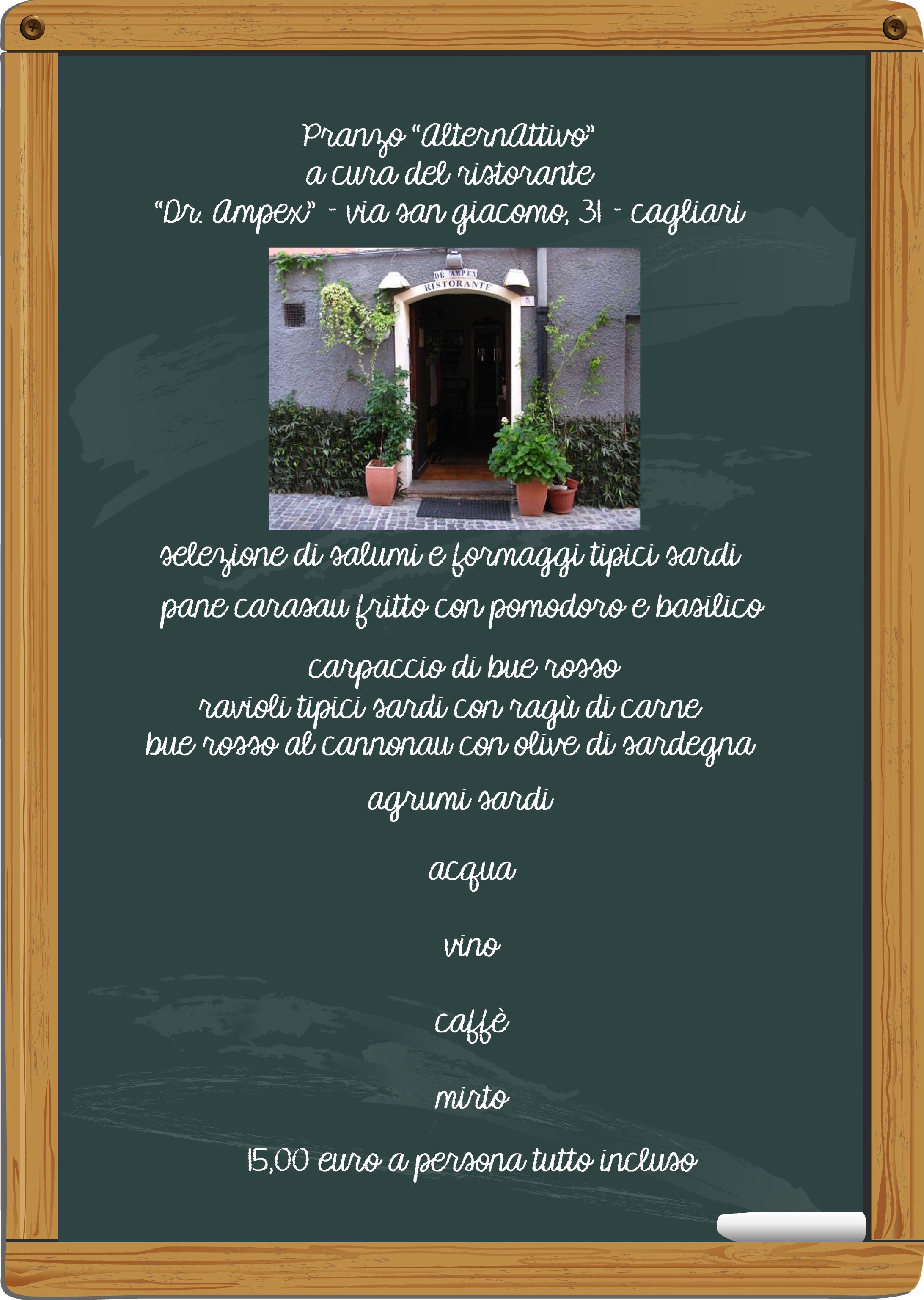La passeggiata guidata si concluderà con un pranzo “AlternAttivo” presso il ristorante “Dr. Ampex” di via san giacomo, 31 a Cagliari (si allega il menu).
