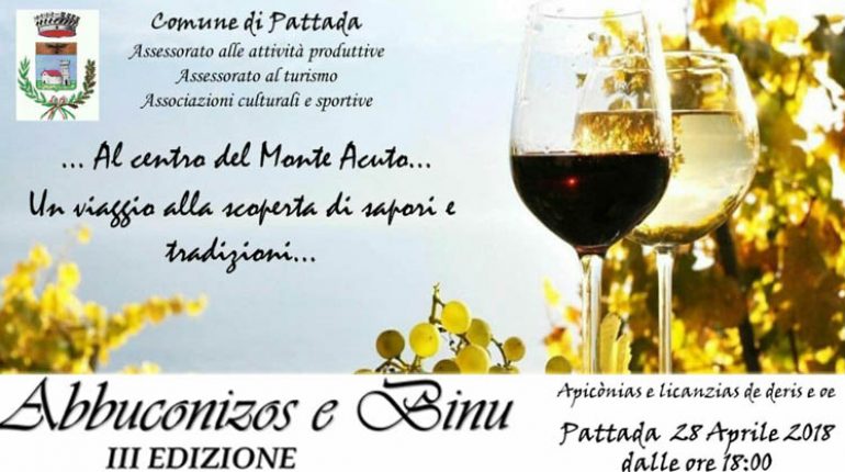 si svolgerà nella serata di sabato 28 aprile 2018 a Pattada, nella regione storica del Monteacuto, la terza edizione della manifestazione “Abbuconizos e binu, apiconias e licanzias de deris e oe“, un itinerario enogastronomico alla scoperta dei sapori e dei profumi della tradizione culinaria locale. Lo scorso anno furono oltre milleottocento i visitatori che, dotati di calice e sacchetta, parteciparono all’evento che nasce con lo scopo di promuovere la tradizione culinaria e artigianale del paese.