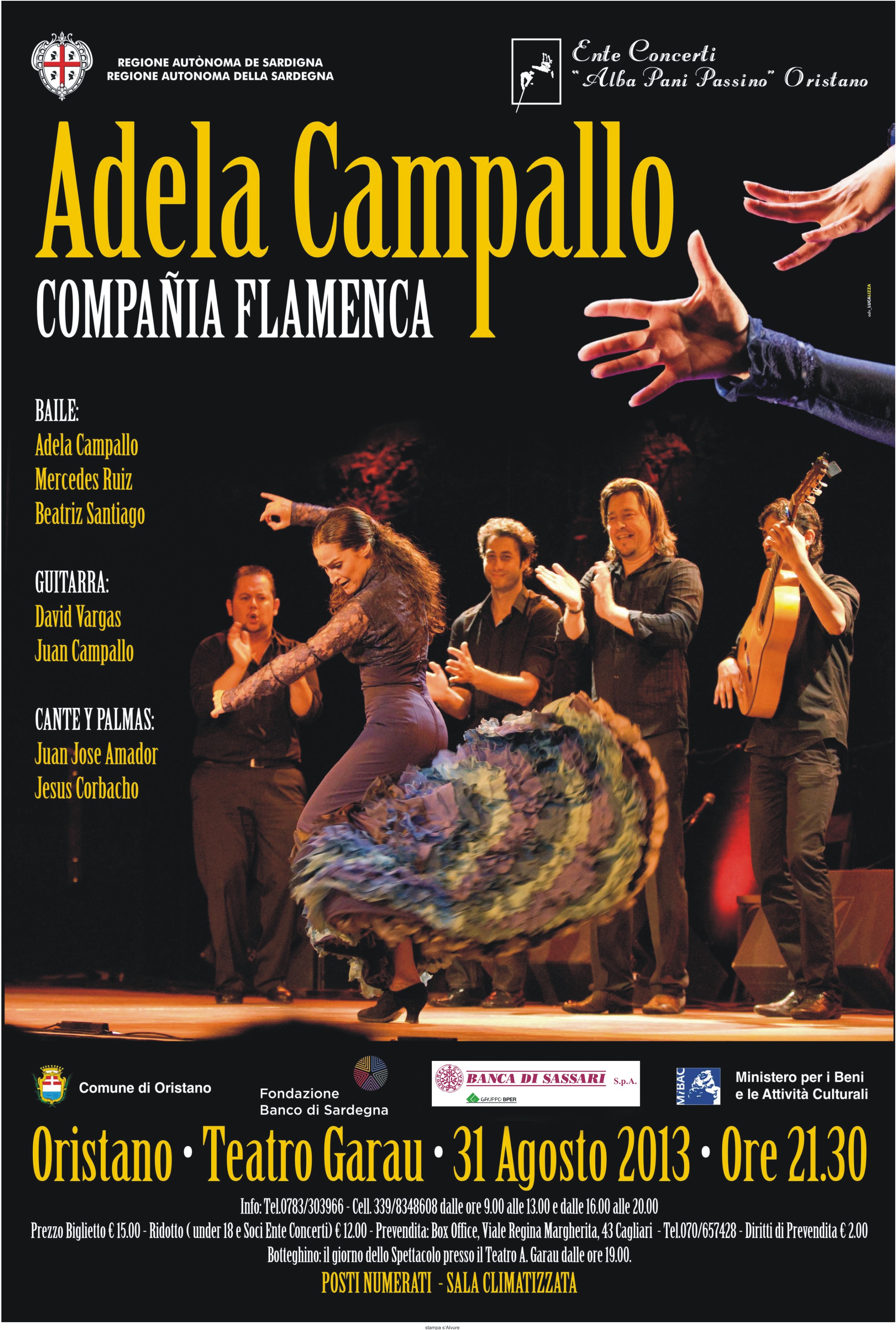 Sabato 31 Agosto alle ore 21.30, presso il Teatro “A. Garau” di Oristano, nell’ ambito della 39ª Stagione Concertistica 2013, l’ Ente Concerti “Alba Pani Passino” ha il piacere di ospitare la “Compaňia flamenca” di Adela Campallo.