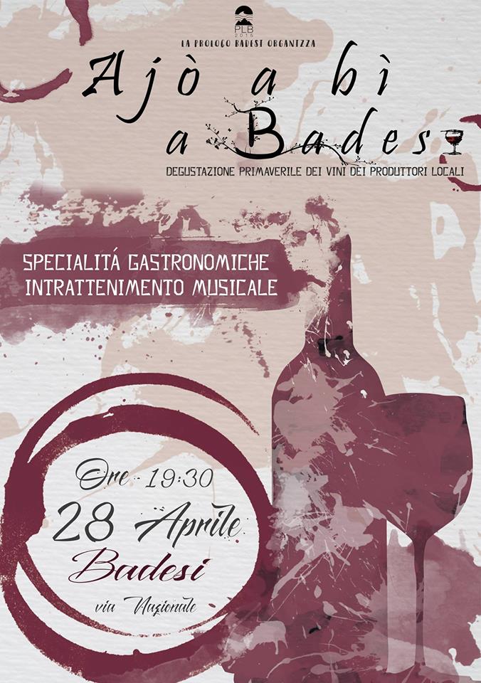 AJO’ A BI’ – BADESI – SABATO 28 APRILE 2018 Reviewed by admin on . AJO' A BI' - BADESI - SABATO 28 APRILE 2018 Serata di degustazione dei vini locali accompagnati da piatti tipici AJO' A BI' - BADESI - SABATO 28 APRILE 2018 Serata di degustazione dei vini locali accompagnati da piatti tipici Rating: 0
