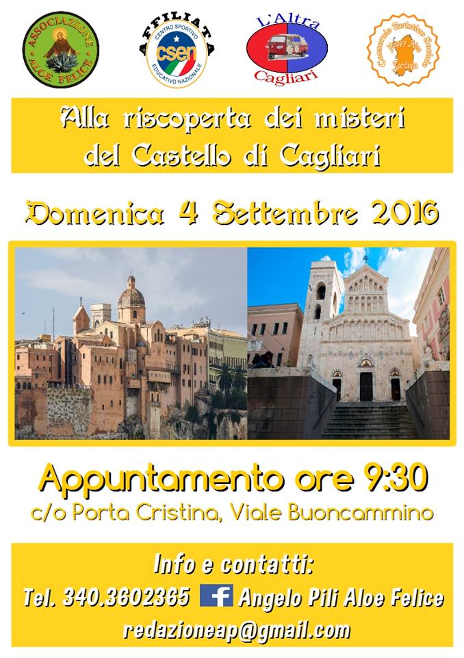 Aloe Felice e L’Altra Cagliari, organizzano per domenica 4 settembre il 2° incontro, del workshop formativo di sei conferenze itineranti per i quartieri storici di Cagliari, per “GUIDA CULTURALE IDENTITARIA CAGLIARITANA”.il secondo incontro, verterà sul Castello di Cagliari, denominato dai Cagliaritani, Castedd’e Susu, il castello di sopra, i suoi monumenti, i personaggi che hanno caratterizzato l’antica rocca, le storie, i racconti, i misteri, gli aneddoti.