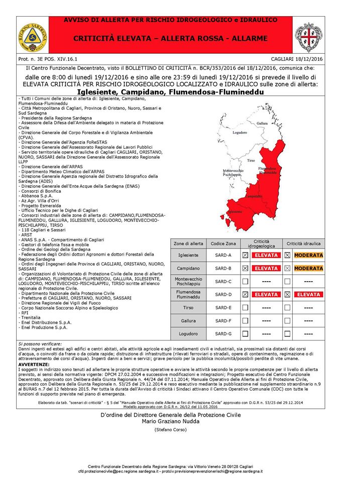 ALLERTA METEO ROSSA A CAGLIARI E HINTERLAND, IGLESIENTE, OGLIASTRA, SARRABUS E MEDIO CAMPIDANO Reviewed by admin on . Allerta meteo. Abbiamo disposto per la giornata di domani (lunedì 19 dicembre) la chiusura delle scuole cittadine di ogni ordine e grado, delle sedi universitar Allerta meteo. Abbiamo disposto per la giornata di domani (lunedì 19 dicembre) la chiusura delle scuole cittadine di ogni ordine e grado, delle sedi universitar Rating: 0