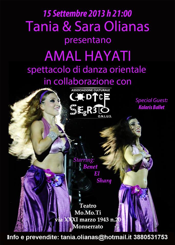AMAL HAYATI – SPETTACOLO DANZA ORIENTALE – TEATRO MOMOTI – MONSERRATO – DOMENICA 15 SETTEMBRE 2013AMAL HAYATI – ORIENTAL DANCE – MOMOTI THEATRE – MONSERRATO – SUNDAY SEPTEMBER 15 Reviewed by admin on . Una serata dedicata alla danza orientale e alle sue molteplici espressioni, dalla tradizione del folklore egiziano all'eleganza del Raqs Sharqi, dai ritmi coinv Una serata dedicata alla danza orientale e alle sue molteplici espressioni, dalla tradizione del folklore egiziano all'eleganza del Raqs Sharqi, dai ritmi coinv Rating: