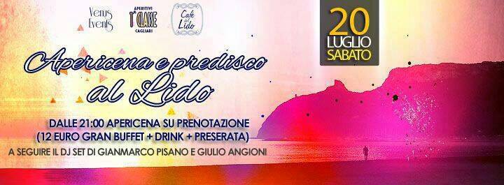 APERICENA & PREDISCO – LIDO BEACH – CAGLIARI – SABATO 20 LUGLIO 2013APERIDINNER & PREDISCO – LIDO BEACH – CAGLIARI – SATURDAY JULY 20 Reviewed by admin on . SABATO l'apericena e predisco del Poetto di Cagliari è al LIDO! Buffet + drink a scelta + predisco con dj set di G. Angioni e G. Pisano 12€! Prenotazioni al 349 SABATO l'apericena e predisco del Poetto di Cagliari è al LIDO! Buffet + drink a scelta + predisco con dj set di G. Angioni e G. Pisano 12€! Prenotazioni al 349 Rating: