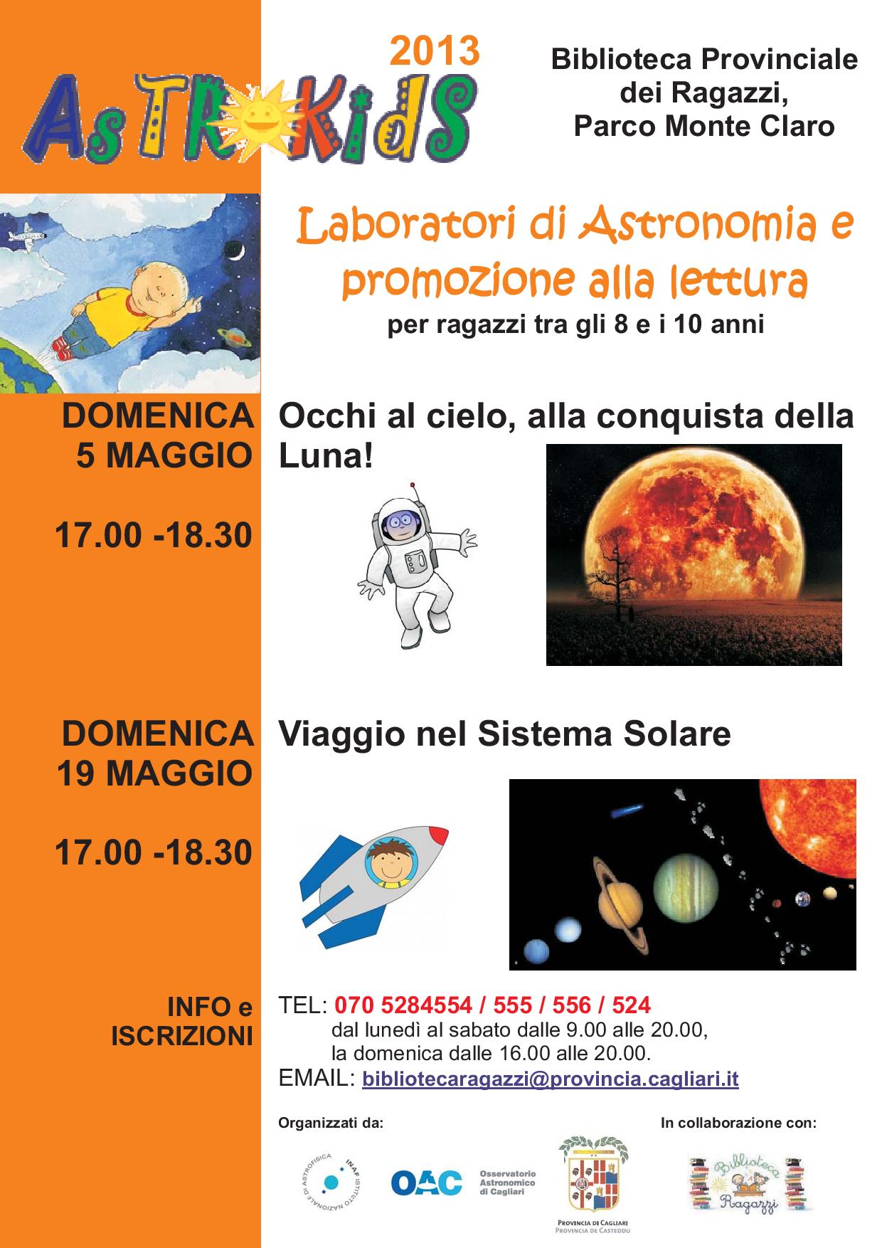 L’INAF-Osservatorio Astronomico di Cagliari e la Provincia di Cagliari, in collaborazione con la Biblioteca Provinciale Ragazzi, propongono due laboratori di astronomia denominati “Astrokids” per bambini di età compresa tra 8 e 10 anni, che verranno realizzati in un contesto ludico e di promozione alla lettura.