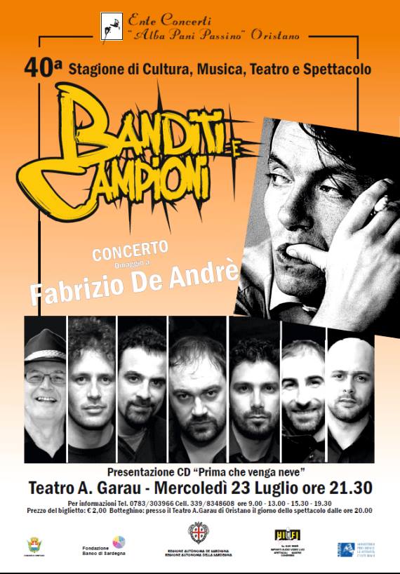 Mercoledì 23 luglio presso il Teatro “A. Garau” di Oristano alle ore 21.30, nell’ ambito della 40ª Stagione Concertistica 2014 dell’Ente Concerti “Alba Pani Passino”, si terrà il concerto della band “Banditi e Campioni” durante il quale verrà presentato al pubblico il cd: “Prima che venga neve”, un chiaro omaggio all’ indimenticabile Fabrizio De Andrè.