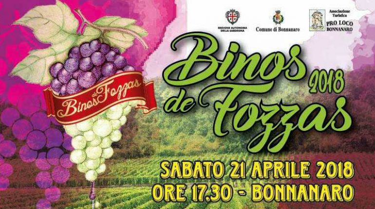Torna anche quest’anno a Bonnanaro – nella serata di sabato 21 aprile 2018 con inizio alle ore 17:30 – , l’attesa manifestazione enogastronomica “Binos de Fozzas” organizzata dalla locale Pro Loco in collaborazione con i viticoltori di questo piccolo paese del Mejlogu. La manifestazione si distingue perché ad ognuna delle cantine, nelle quali è possibile degustare il vino e i prodotti tipici locali, viene assegnato il nome di un canto della tradizione di Bonnanaro, una volta eseguito a Cuncordu. Un modo insomma per unire e promuovere ancor meglio la cultura del vino e le tradizioni del paese. Il calice viene venduto a 10 euro.