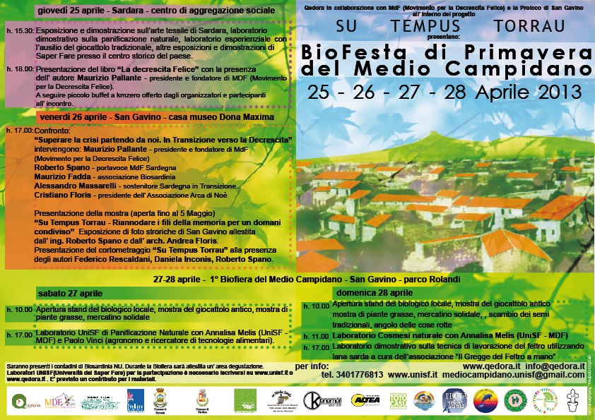 L’Associazione di promozione sociale Qedora in collaborazione con Movimento per La Decrescita Felice e Proloco San Gavino presenta la Biofesta di Primavera del Medio Campidano che si terrà in varie location specificate in seguito a partire dal 25 fino al 28 Aprile.