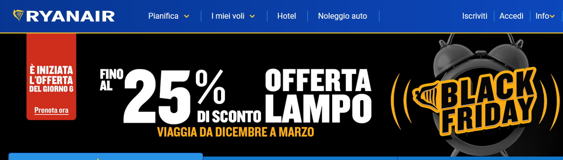 BLACK FRIDAY RYANAIR – 25% SCONTO SUI VOLI DA DICEMBRE A MARZO 2020