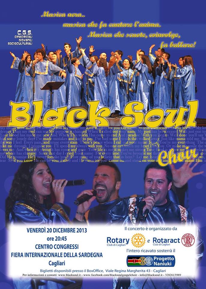 L’unico concerto gospel DI BENEFICENZA con i Black Soul Gospel Choir organizzato dal Rotary Club Cagliari e dal Rotaract Club Cagliari. I proventi andranno al Progetto Nanyuki che sostiene l’omonima parrocchia keniota di Don Franco Crabu, sacerdote missionario della Diocesi di Cagliari. I biglietti (posto unico Euro 10) sono disponibili ONLINE al link http://www.boxol.it/eventi/2013/12/20/concerto-gospel-natale-palazzo-dei-congressi-cagliari/, oppure presso il BoxOffice di Viale Regina Margherita 43 Cagliari, aperto dal lunedì al venerdì dalle 10 alle 13 e dalle 17 alle 20 e il sabato solo la mattina dalle 10 alle 13 (tel. 070657428). Il concerto si svolgerà al Palazzo dei Congressi (Centro Congressi) della Fiera di Cagliari. INGRESSO LATO C.O.N.I. (Viale Colombo).