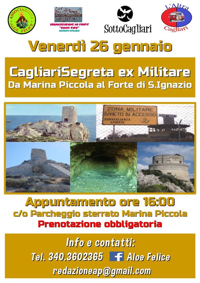 L’ associazione Aloe Felice, insieme al movimento di impegno civile, L’Altra Cagliari, organizzano venerdi 26 gennaio, una passillara alla scoperta della Cagliari Segreta ed ex militare.