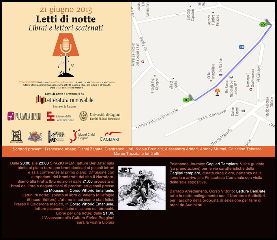 La sera di venerdì 21 giugno 2013, inizieremo la nostra visita dalla Galleria Comunale, sita all’interno dei Giardini Pubblici. Proseguiremo poi verso Stampace, rileggendo la sua storia medievale, la cui eco templare è ancora presente tra le righe. Molti scrittori hanno celebrato Cagliari nelle loro opere e alcuni verranno ricordati durante la visita guidata mentre altri libri ad essa dedicati saranno esposti nelle vetrine degli esercizi commerciali che aderiscono all’iniziativa.