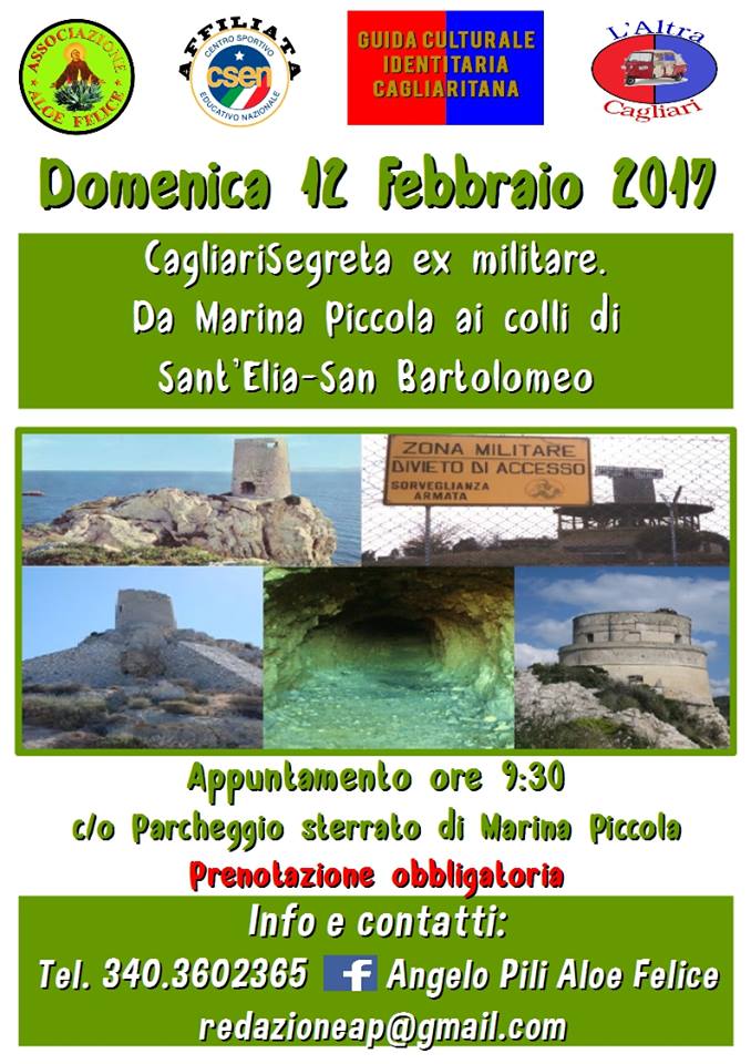 L’ associazione Aloe Felice, insieme al movimento di impegno civile, L’Altra Cagliari, organizzano domenica 12 febbraio, una passillara alla scoperta della Cagliari Segreta ed ex militare.