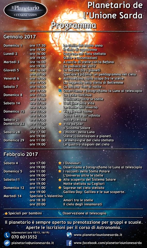 CALENDARIO DELLE ATTIVITA’ DEL PLANETARIO DI CAGLIARI – GENNAIO/ FEBBRAIO 2017