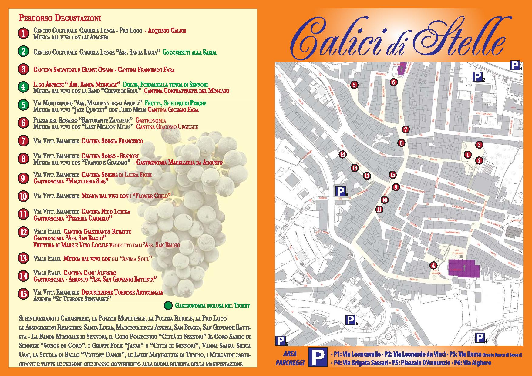 Pieghevoli Fronte-page-001L’evento prenderĂ  il via venerdì 7 Agosto dalle ore 20:00, quando il centro storico di Sennori si trasformerĂ  nel palcoscenico per la degustazione dei vini del territorio in abbinamento alle eccellenze gastronomiche locali.  Parteciperanno nove cantine locali , la confraternita del moscato Sorso – Sennori e la cantina sociale Sorso-  Sennori tutti dislocati negli angoli piĂą suggestivi del centro storico del paese. L’evento si svolgerĂ  in modo itinerante, attraverso le vie del suggestivo centro storico, dove verranno allestiti gli stands per le degustazioni. Il tiket si potrĂ  acquistare a partire dalle ore 19:30 presso il Centro Culturale al costo di  €10,00 e comprenderĂ :