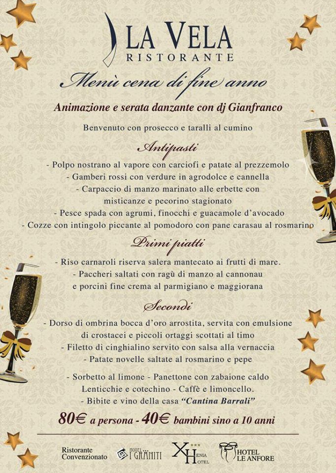 IL RISTORANTE LA VELA COMUNICA COME TUTTI GLI ANNI AI SUOI GENTILI CLIENTI CHE SONO APERTE LE PRENOTAZIONI PER IL GRAN VEGLIONE DI CAPODANNO 2019 CON TANTO DIVERTIMENTO E ANIMAZIONE , A VOI IL MENU’ DETTAGLIATO, PER INFO E PRENOTAZIONI:3928780232… POSTI LIMITATI