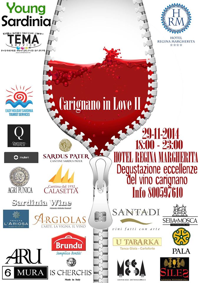 CARIGNANOINLOVESabato 29 Novembre 2014 dalle ore 18:00 alle 24:00 presso l’ elegante location Hotel Regina Margherita a Cagliari, si terrà la seconda edizione dell’ unico evento totalmente dedicato al vitigno autoctono Carignano.