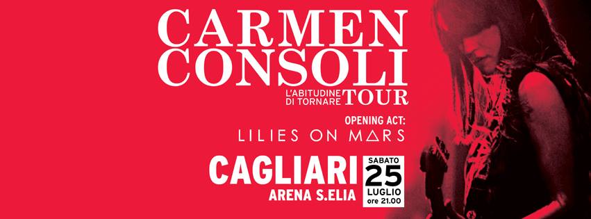Carmen Consoli rompe il silenzio e ritorna, come sua consuetudine, a Cagliari, il 25 luglio. Un nuovo appuntamento con la cantatessa di Catania che dopo cinque anni di assenza dal suo penultimo album “Elettra” riparte con un nuovo capitolo discografico dal titolo “L’abitudine di tornare” uscito a gennaio 2015 per la Universal e già Disco D’Oro. L’appuntamento con il concerto dell’estate sarà all’Arena S. Elia, organizzato da Sardegna Concerti per il cartellone dei Grandi Eventi in Sardegna. E già da domani si potranno acquistare in prevendita i biglietti: posto unico a 25 Euro (compresi i diritti di prev.) sia nel parterre che in tribuna (Info: Sarconline Tel. 070/6670498 e Box Office Tel. 070/657428).