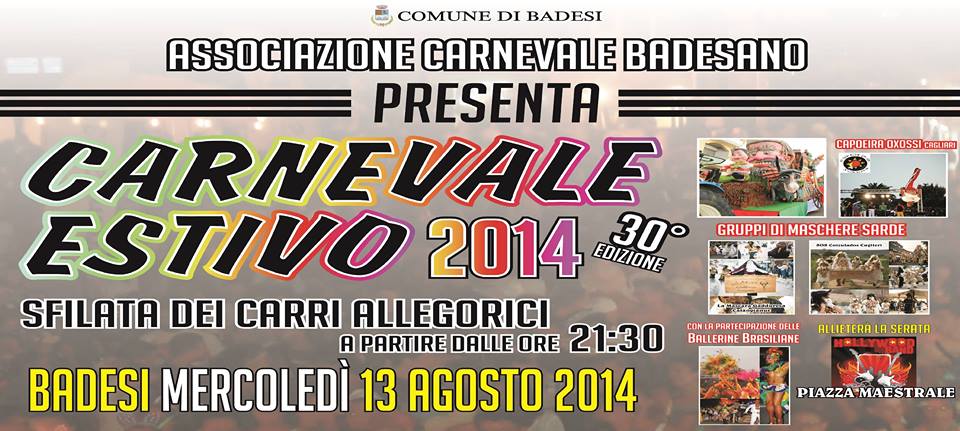 CARNEVALE ESTIVO 2014 – BADESI – MERCOLEDI 13 AGOSTO 2014SUMMER CARNIVAL 2014 – BADESI – WEDNESDAY AUGUST 13,2014 Reviewed by admin on . L' associazione carnevale badesano, in collaborazione con il Comune di Badesi e tutti i volontari, organizza per il trentesimo anno il CARNEVALE ESTIVO. Quest'a L' associazione carnevale badesano, in collaborazione con il Comune di Badesi e tutti i volontari, organizza per il trentesimo anno il CARNEVALE ESTIVO. Quest'a Rating: 0