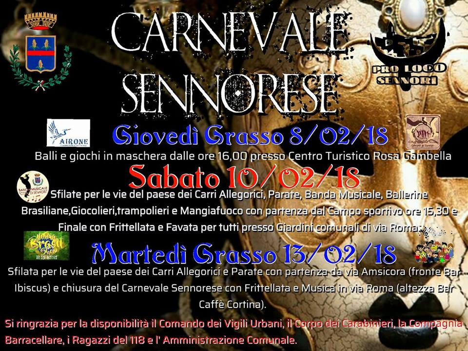 La Proloco col patrocinio del Comune di Sennori ha organizzato un ricco cartellone di appuntamenti per festeggiare il “Carnevale Sennorese”. Tre le giornate di festa in programma: si inizierà giovedì 8 febbraio dalle ore 16 alle 20, al centro turistico sopra i parcheggi di via Roma, con animazione, giochi, musica e frittelle per grandi e piccini, organizzati in collaborazione con la cooperativa Airone.