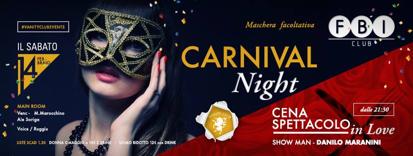 Amici ed Amiche dopo la SPLENDIDA serata di Sabato scorso, siamo lieti ed onorati di invitarvi al vostro appuntamento del Sabato Notte all’ F.B.I. con il Carnival Night, maschera FACOLTATIVA.