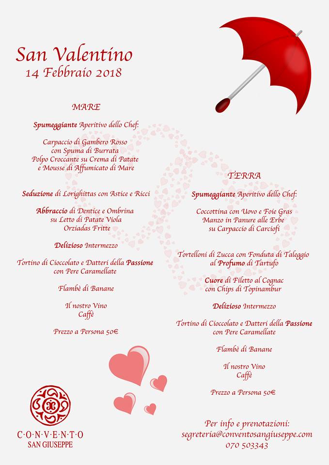 CENA DI SAN VALENTINO AL CONVENTO SAN GIUSEPPE – CAGLIARI – MERCOLEDI 14 FEBBRAIO 2018