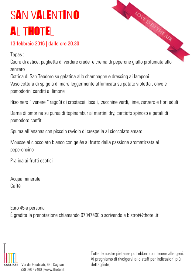 CENA DI SAN VALENTINO -T HOTEL – CAGLIARI – SABATO 13 FEBBRAIO 2016 Reviewed by admin on . Scoprite il nostro menu di passione: Cena di San Valentino: Sabato 13 febbraio, 45 euro a persona. Per prenotazioni scrivete a: bistrot@thotel.it oppure chiamat Scoprite il nostro menu di passione: Cena di San Valentino: Sabato 13 febbraio, 45 euro a persona. Per prenotazioni scrivete a: bistrot@thotel.it oppure chiamat Rating: 0