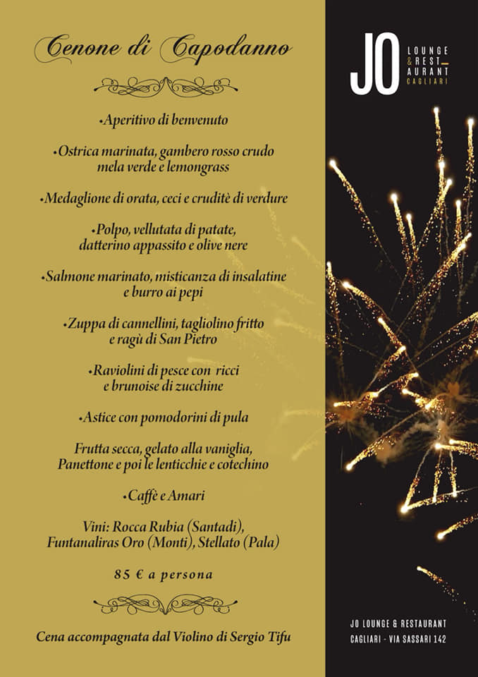 CENONE DI CAPODANNO 2019 AL JO LOUNGE RESTAURANT – CAGLIARI – LUNEDI 31 DICEMBRE 2018 Reviewed by admin on . Il Nostro Menù di Capodanno preparato dal maestro Giuseppe Falanga La cena verrà accompagnata dal violino di Sergio Tifu Per info e prenotazioni 070651639 / 340 Il Nostro Menù di Capodanno preparato dal maestro Giuseppe Falanga La cena verrà accompagnata dal violino di Sergio Tifu Per info e prenotazioni 070651639 / 340 Rating: 0