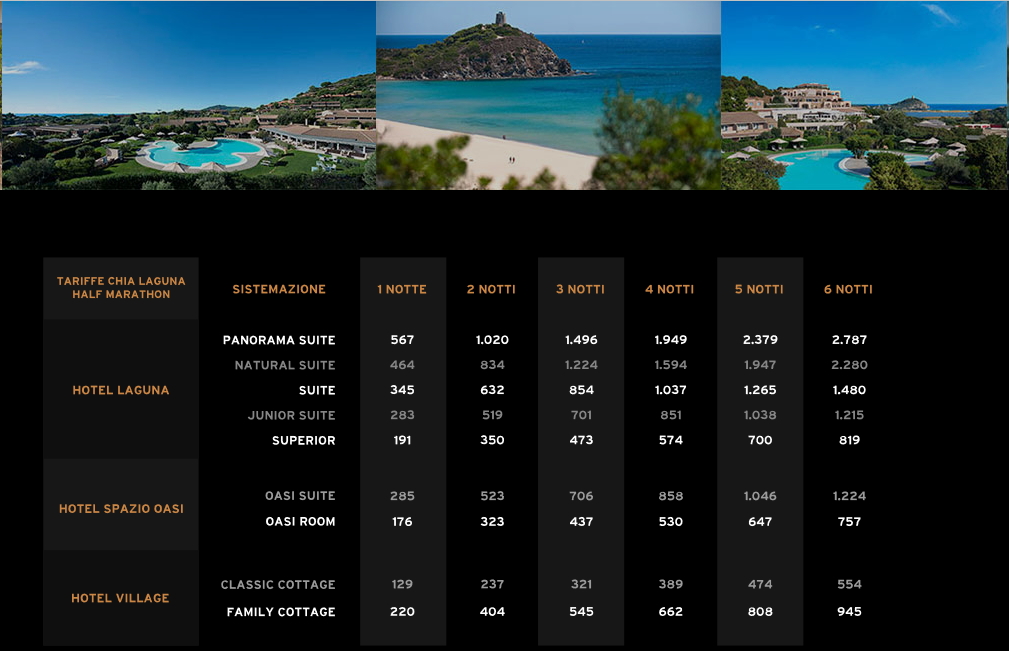 La Chia Laguna Half Marathon è un’occasione unica per abbinare all’allenamento sportivo tutto il piacere di una vacanza in Sardegna e la partecipazione alla gara sarà solo una parte dell’esperienza. Il Chia Laguna propone per l’occasione Speciali Pacchetti Soggiorno in grado di soddisfare le esigenze degli atleti che desiderano regalarsi anche momenti di relax, con i parenti e gli amici pronti a seguire le loro imprese sportive da vicino.